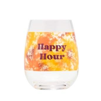 Unwind and relax at the end of the day with your favourite glass of wine. This groovy wine glass from Blurred features a yellow and orange tie dye design with caption 'Happy Hour'.