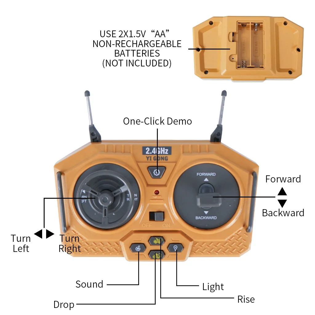 Function: Forward, backward, turn right, left, dig, one-click demo, the console rotate 680°, and with music and light.2.4G Remote Radio: 2.4G anti-interference high-frequency remote control allows several RC cars can be used at the same time and without interfering with each other.