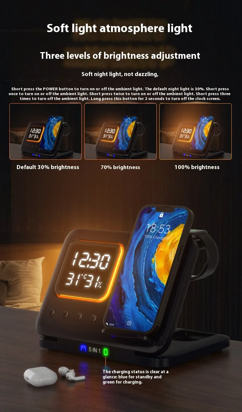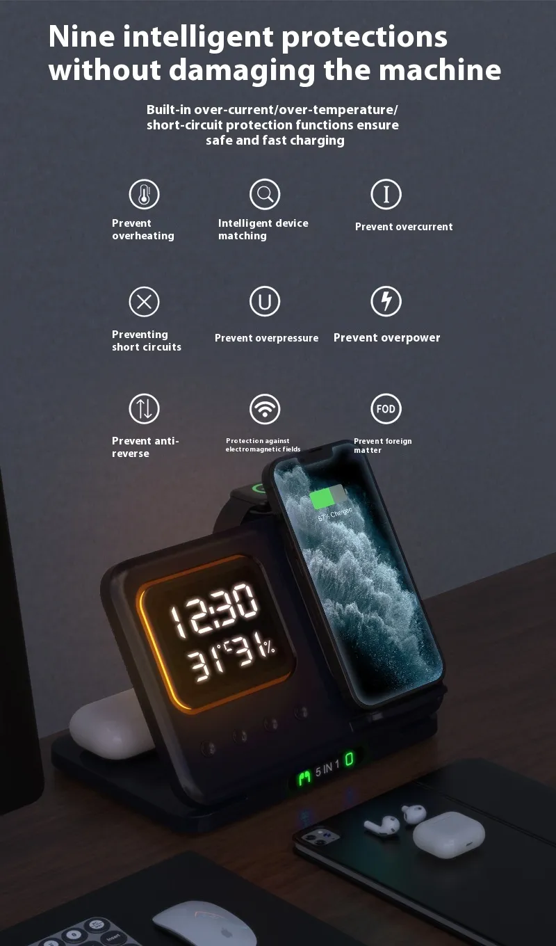 15W Wireless Charger Stand 5-in-1 LED Digital Alarm Clock – Fast Charging Dock Station