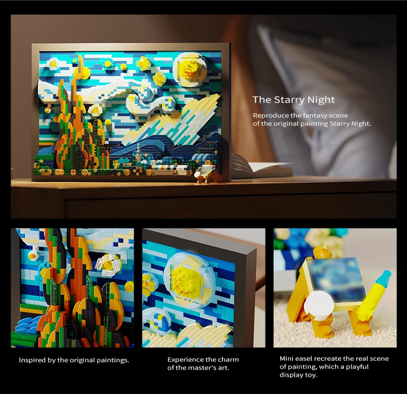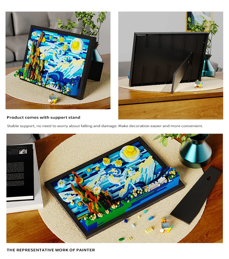 Once completed, the Starry Night building block model serves as an exquisite piece of home decor. Whether you choose to display it in your living room, study, or office, it adds a sophisticated artistic touch to any space. It’s an ideal decoration for art lovers and collectors who want to bring a touch of Van Gogh’s genius into their home.