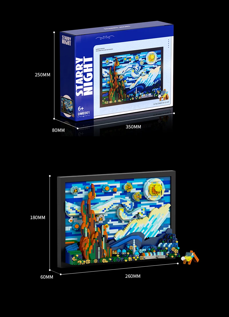 Once completed, the Starry Night building block model serves as an exquisite piece of home decor. Whether you choose to display it in your living room, study, or office, it adds a sophisticated artistic touch to any space. It’s an ideal decoration for art lovers and collectors who want to bring a touch of Van Gogh’s genius into their home.