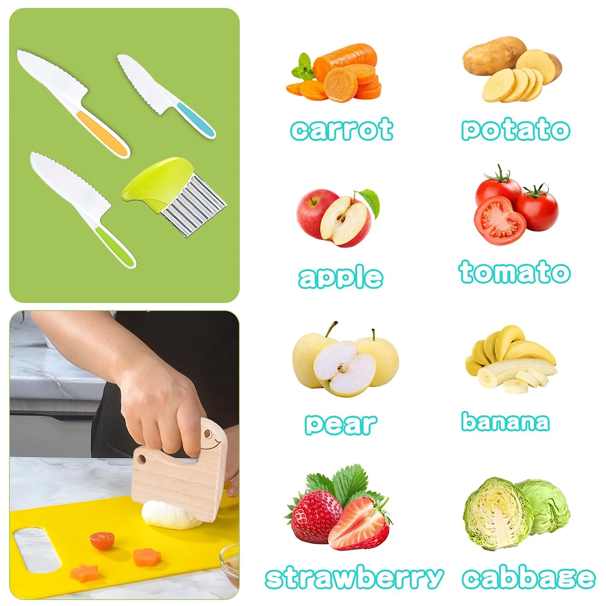 [Safety and Environmental Protection]: The children's knives are made of wood and food-grade PP materials. The potato cutters are made of high-quality stainless steel and PP materials. These children's knives are made of non-toxic, BPA-free materials