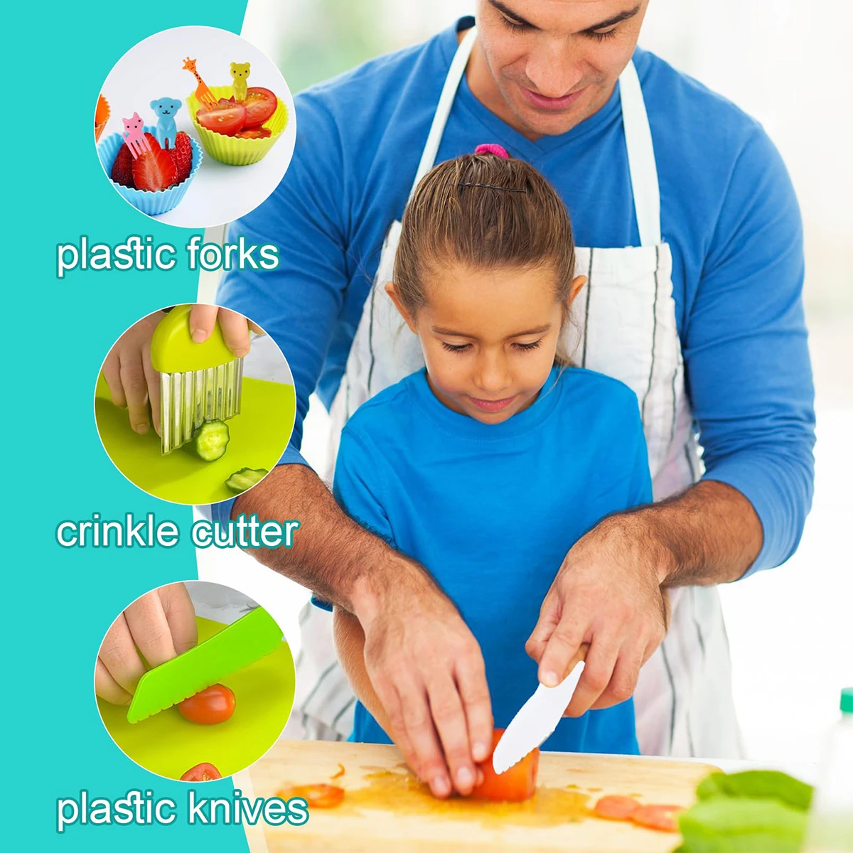 durable, non-sharp plastic, so children can practice cutting food without the risk of injury. The tools are designed for small hands, making