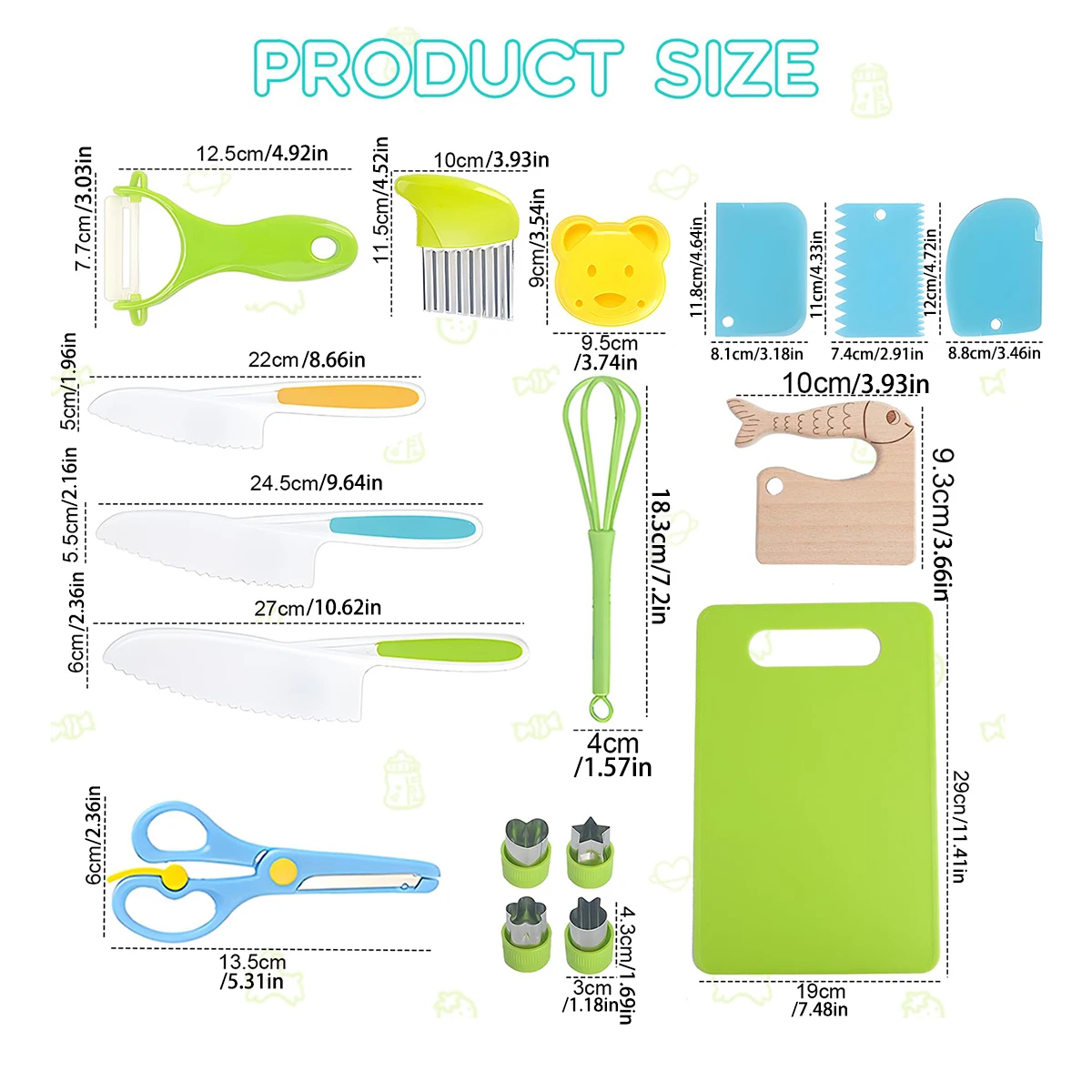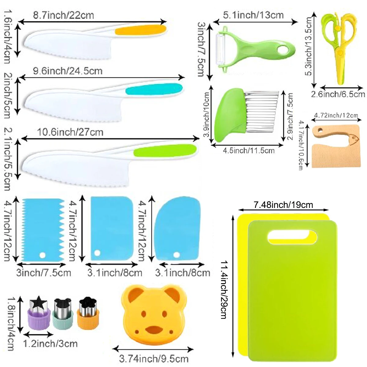 Package Contents [Toddler Cooking Set]: Children's kitchen knife set includes 1 wooden children's knife, 4 children's kitchen knives, 2 cutting boards, 1 Y-shaped paring knife, 4 fruit cutting shapes, 1 groove cutter, 3 cake cutters, 1 bread sandwich mold, 1 children's scissors. The various styles and uses of toddler cookware can meet the needs of children.