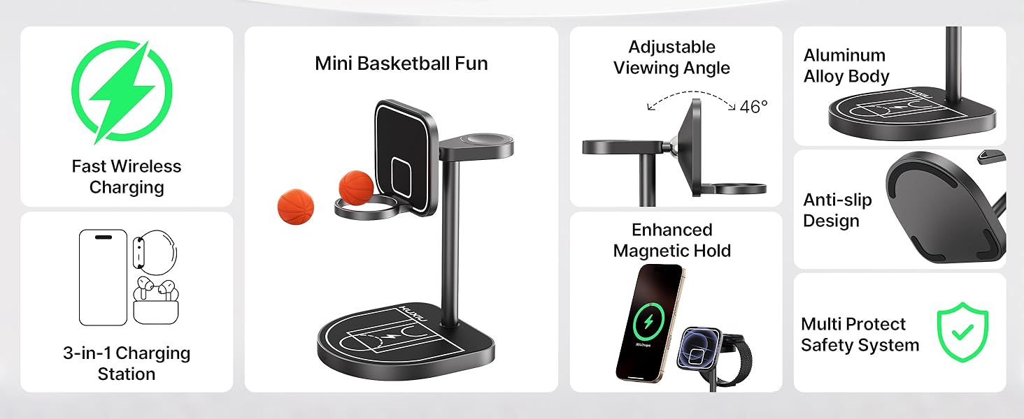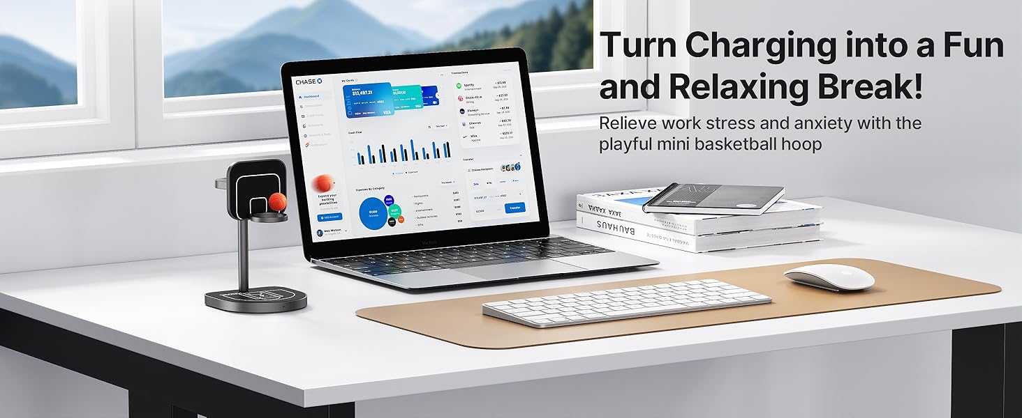 - Fun and Stress-Relief Basketball Design - Inspired by basketball courts, this charger stand includes a magnetic hoop and two mini basketballs, allowing you to play desktop shooting games while charging your devices. Relieve stress and add fun to your workday!