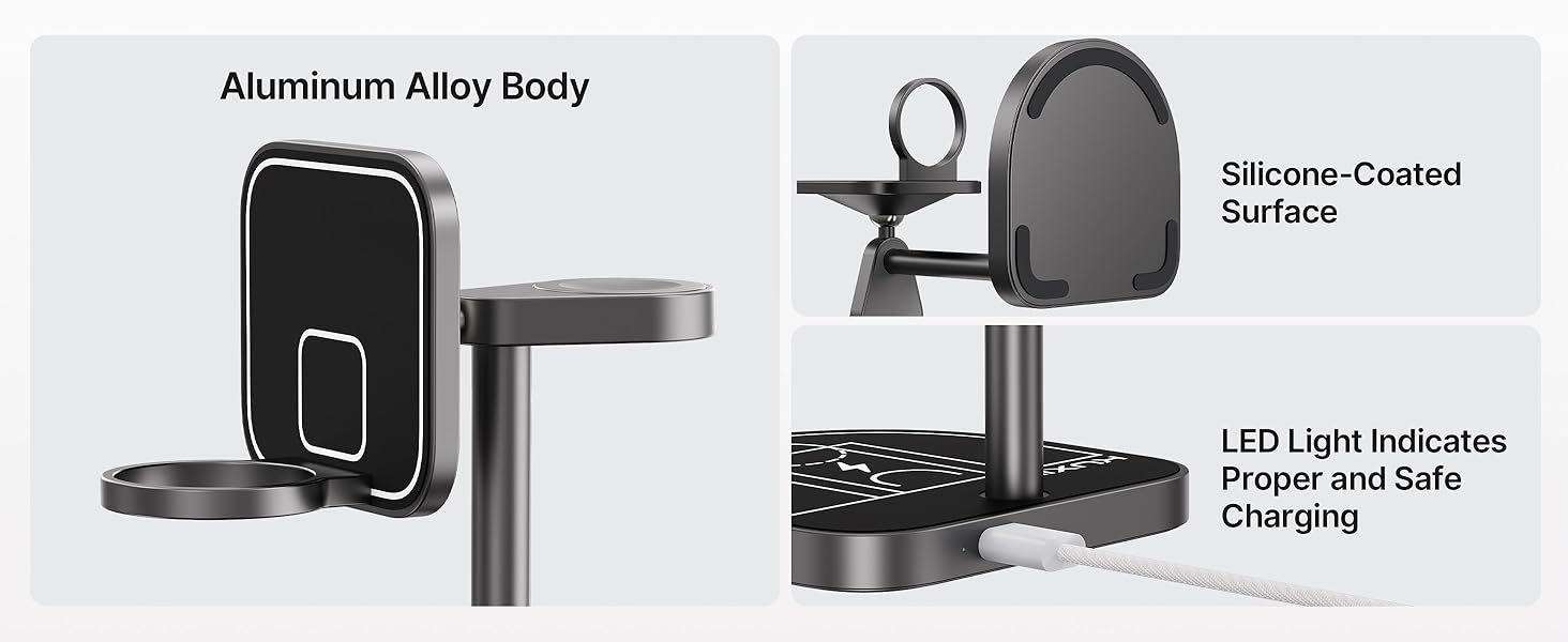 - 【Premium Aluminum Alloy Build】Our wireless charging station is made of Aircraft-grade aluminum alloy and scratch-resistant finish, ensuring excellent durability and better heat dissipation. The headphone charging area is equipped with a non-slip silicone pad to ensure stability. The ergonomically angled design charges your phone horizontally or vertically, perfect for watching videos or live sports, a must-have for Google fans or basketball fans!