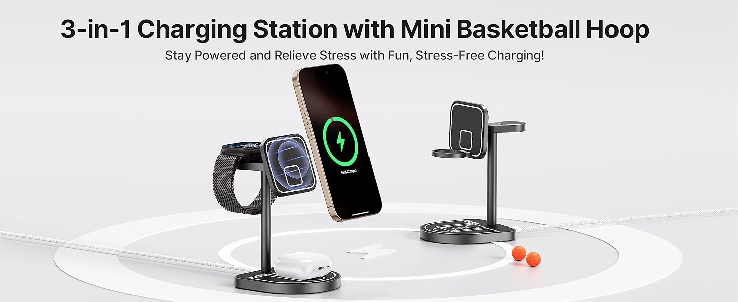- [Three-Point Fun Stress-Relief Design] The KUXIU 3-Point Power wireless charger creatively combines elements of a backboard, hoop, and basketball court, making your 3 in 1 charger out from the crowd! This charger functions as both a powerful 3-in-1 charging station and a playful desktop game accessory. It comes with a magnetic hoop and two mini basketballs, allowing you to enjoy a fun desktop shooting game during free time. Invite your friends to share the joy, and relieve stress!