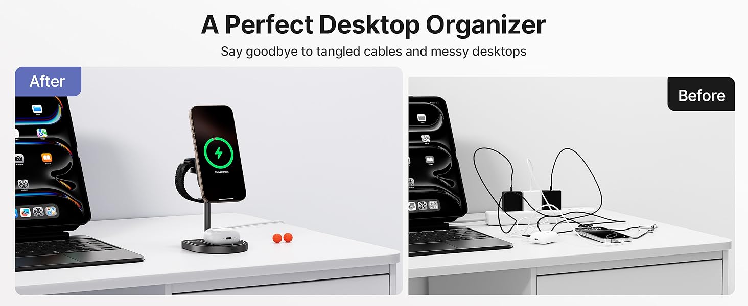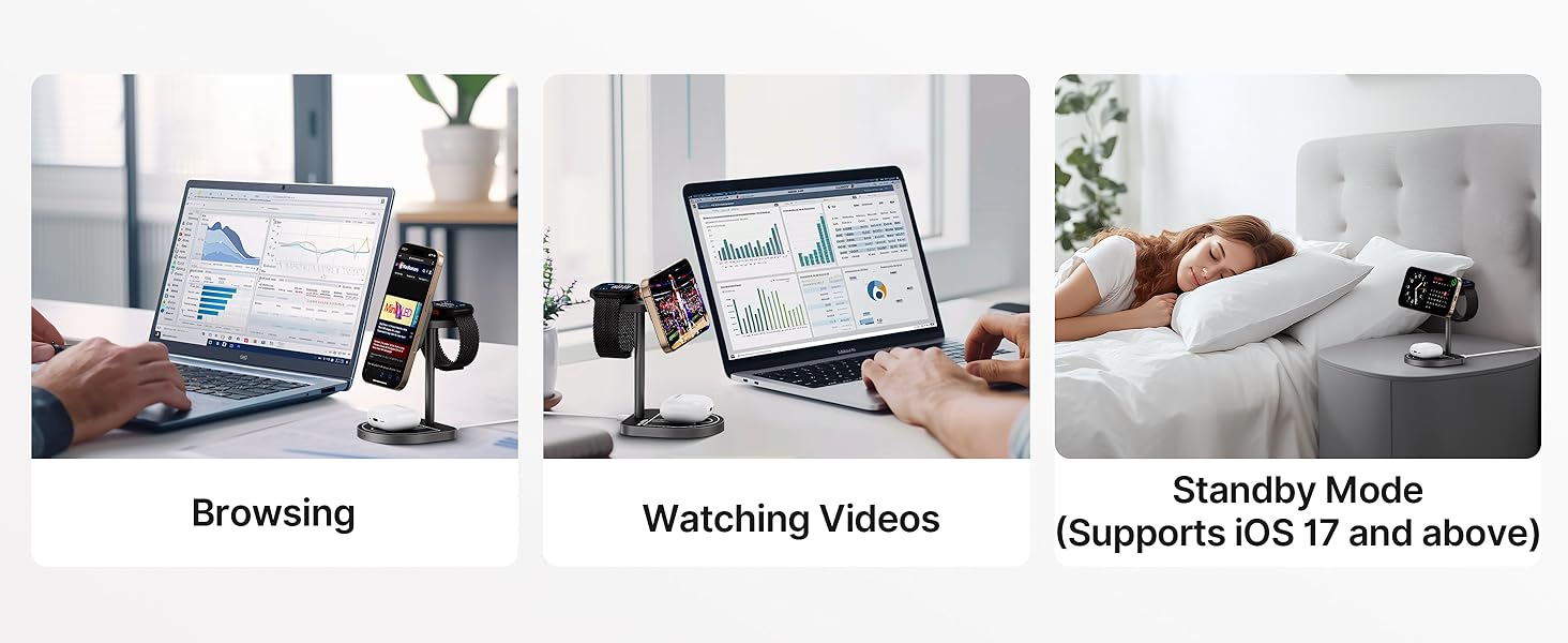 - Magnetic Alignment for Efficient Charging - Built-in magnets ensure perfect alignment in the charging areas for iPhone, Apple Watch, and AirPods, providing fast and efficient charging every time—just place your devices on the stand, and the magnetic pull will do the rest!