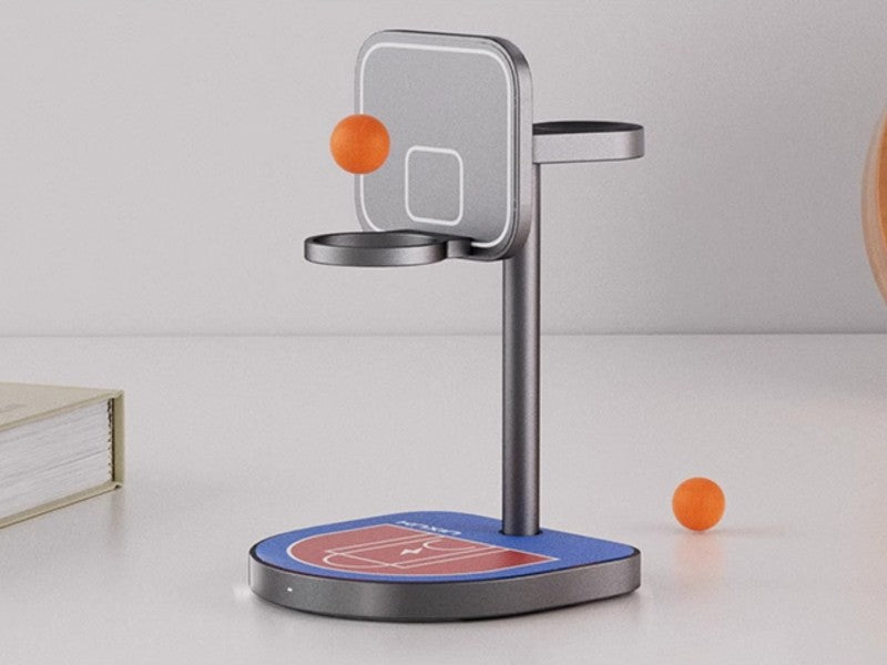 - Fun and Stress-Relief Basketball Design - Inspired by basketball courts, this charger stand includes a magnetic hoop and two mini basketballs, allowing you to play desktop shooting games while charging your devices. Relieve stress and add fun to your workday!