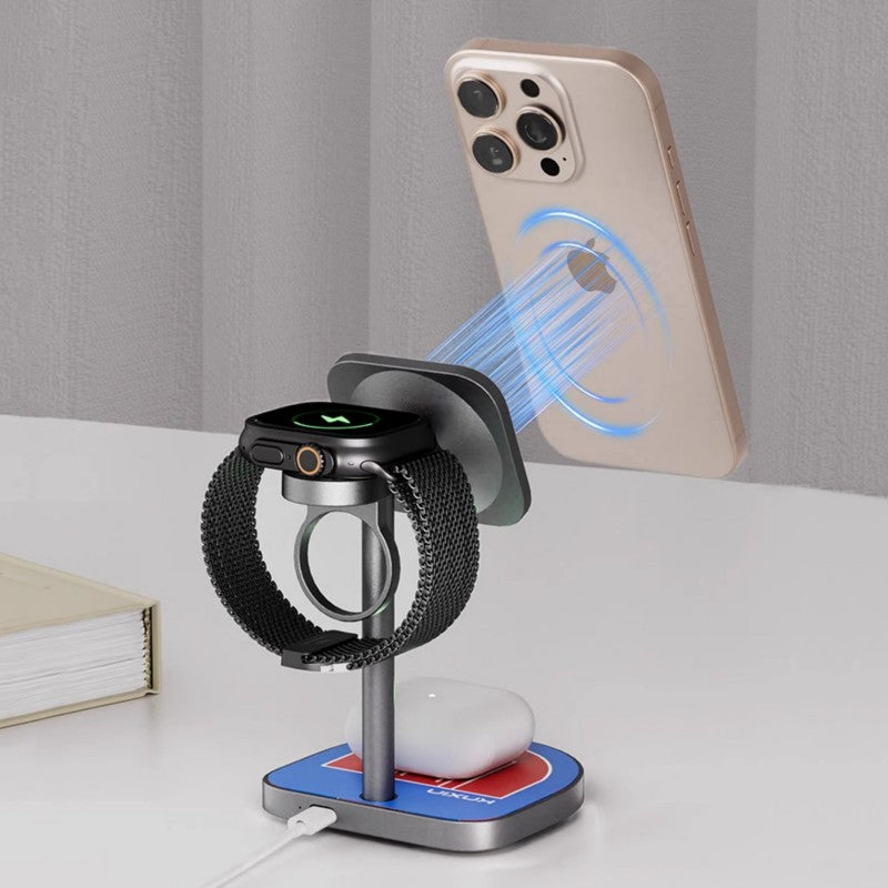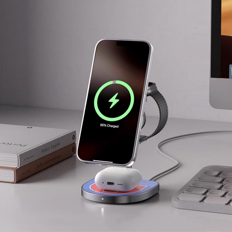 - Magnetic Alignment for Efficient Charging - Built-in magnets ensure perfect alignment in the charging areas for iPhone, Apple Watch, and AirPods, providing fast and efficient charging every time—just place your devices on the stand, and the magnetic pull will do the rest!