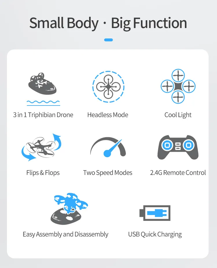 Explore limitless possibilities with the 3-in-1 Mini RC Drone, a versatile drone designed for land, air, and water adventures. This innovative drone offers a unique combination of flying, driving, and floating modes, making it perfect for creative play and exciting challenges. Whether you’re navigating through the skies, cruising on land, or gliding over water, this multi-functional drone guarantees endless fun for both kids and adults.
