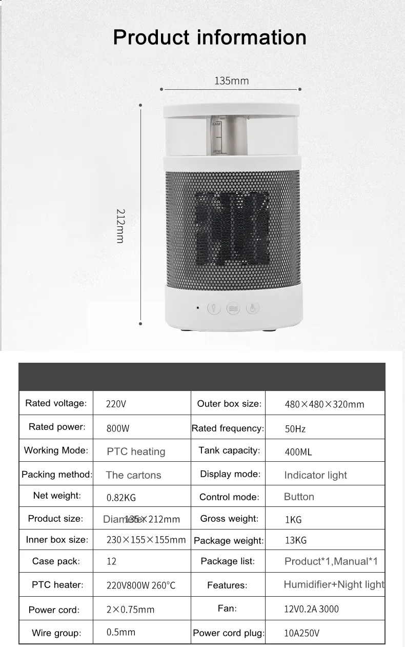 5. The power of this space heater is 800W, and the capacity of the humidifier is 400ml; if you have any questions, you can email us at any