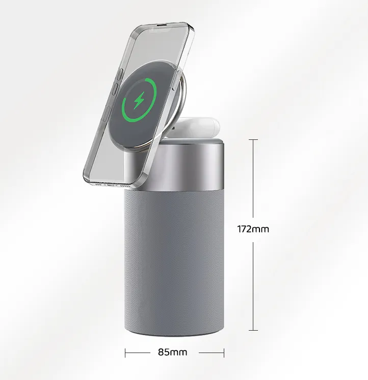 Streamline your space with our 3 In 1 Multi-Function Wireless Charger, combining a charging station for iPhone and AirPods, a Bluetooth speaker, and a touch lamp. Perfect for home and office use, this compact device offers convenience, functionality, and style. With wireless charging capabilities, high-quality audio, and adjustable lighting, it’s the ultimate all-in-one solution for modern tech users.