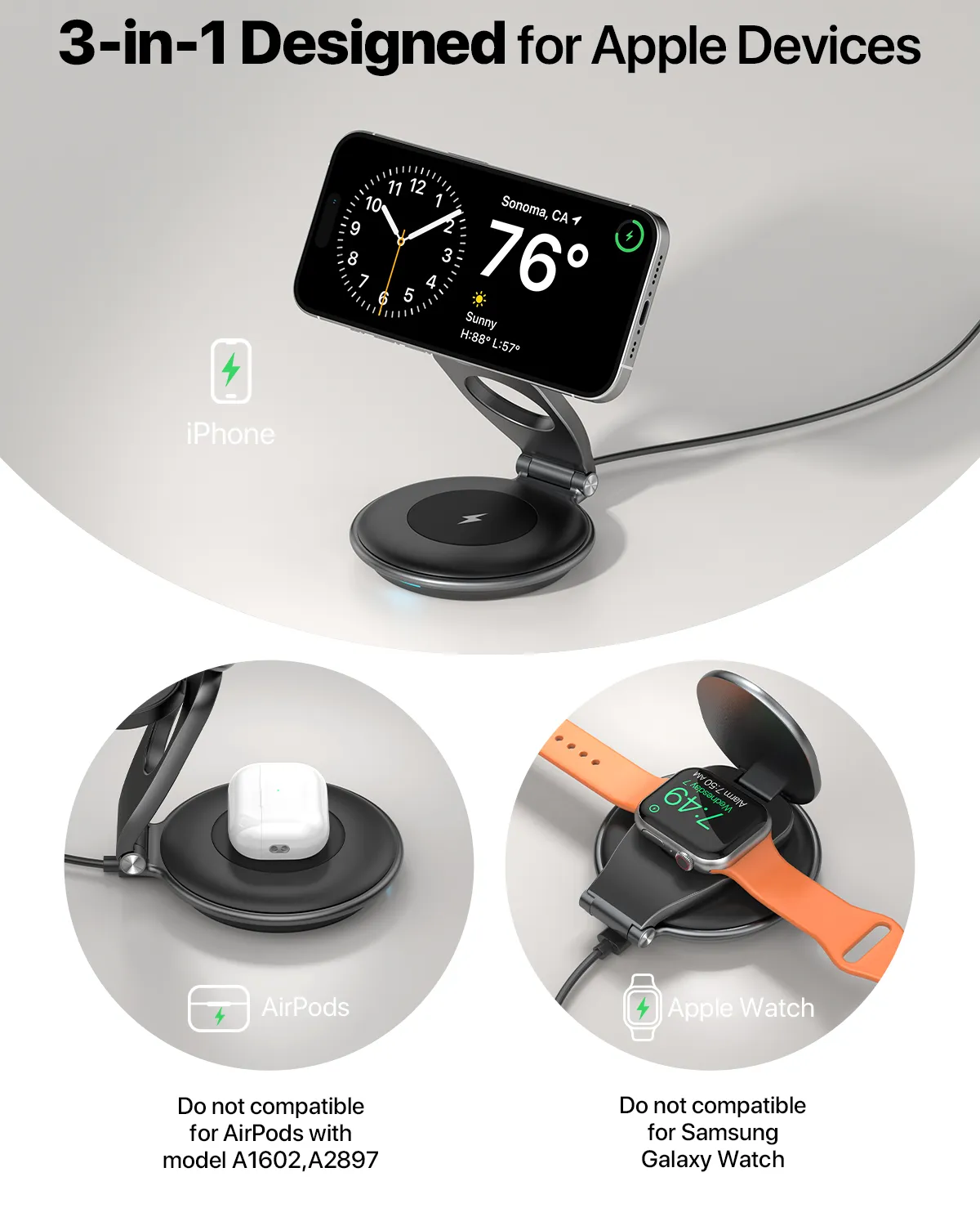 - 3 in 1 Wireless Charging Station:Discover the ultimate convenience with the EXW 3 in 1 wireless charging station.Charger for AirPods,iPhones,and iWatches simultaneously using advanced for MagSafe charger technology.Compact and perfect for clutter-free workspaces and travel.