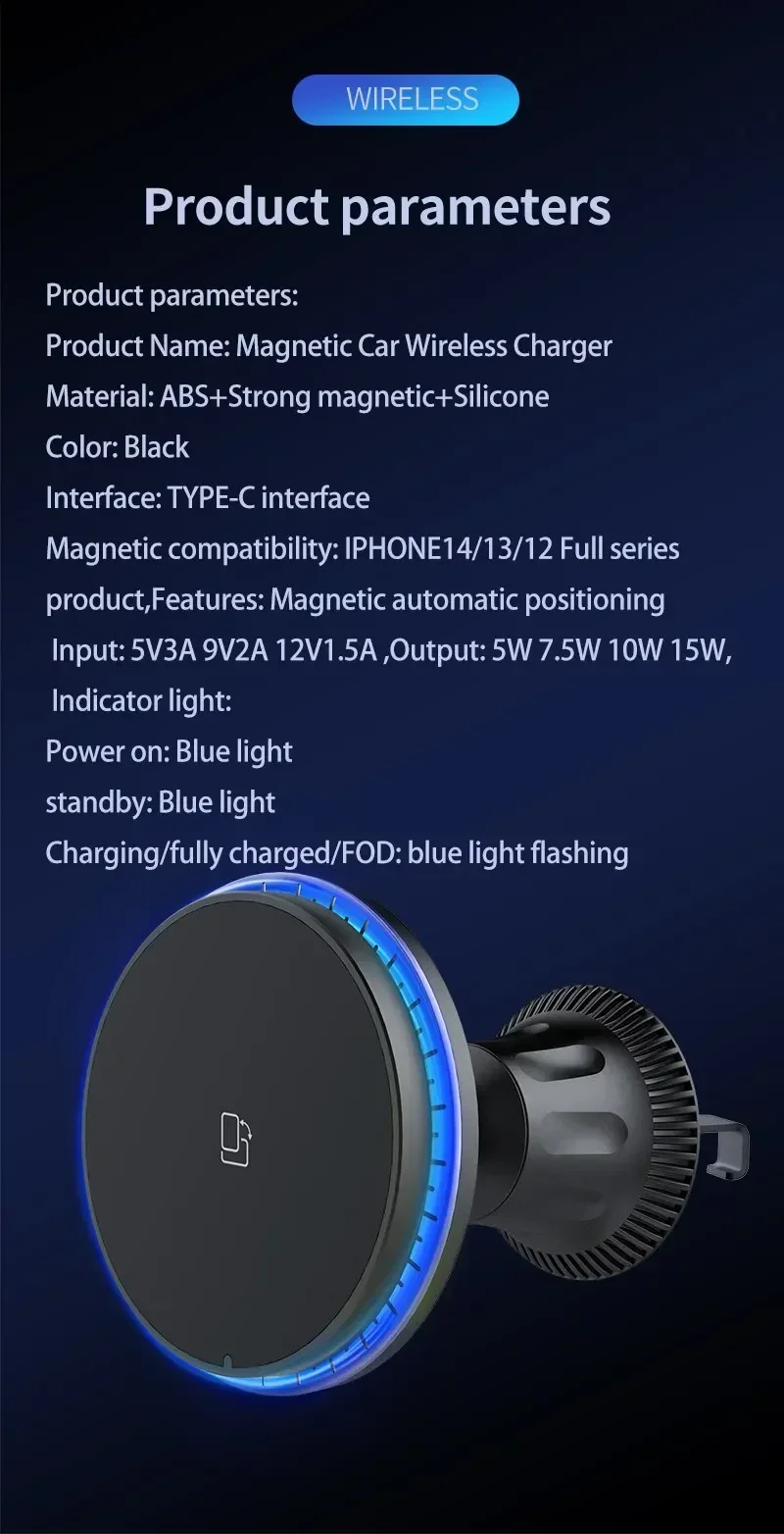 The 30W Magnetic Car Wireless Charger RGB is an essential accessory for anyone who needs reliable phone mounting and fast charging while driving. Its sleek design, strong magnetic hold, 30W fast wireless charging capabilities, and customizable RGB lighting make it a perfect choice for iPhone users. Whether you’re on a long road trip or a short commute, this charger ensures your phone stays secure and fully charged, providing convenience and efficiency in one stylish package. Invest in the 30W Magnetic Car Wireless Charger and experience the benefits of advanced charging technology on the go.