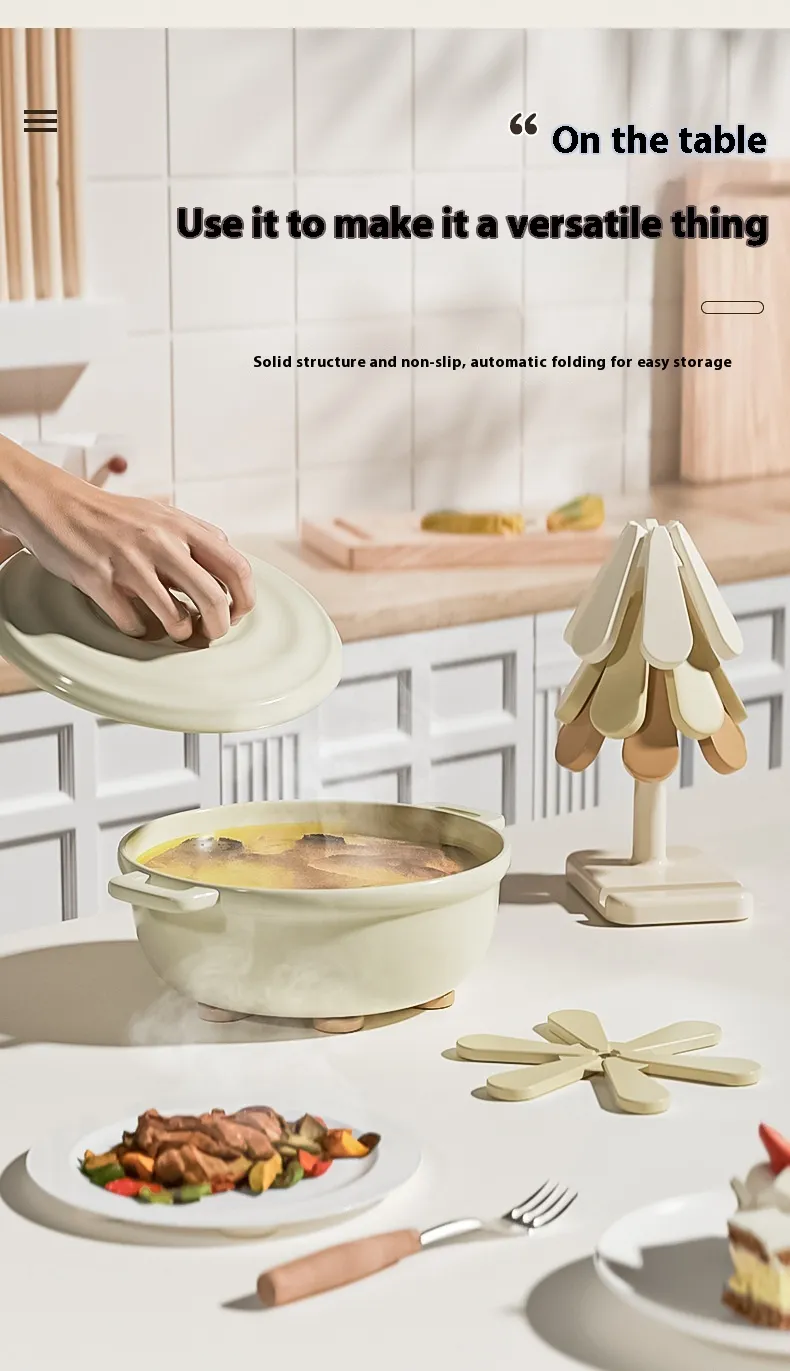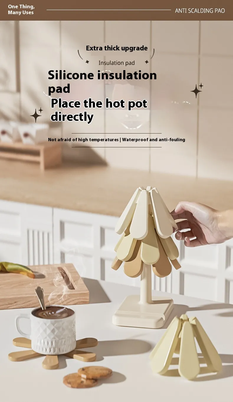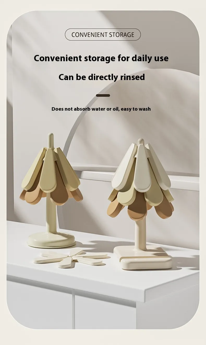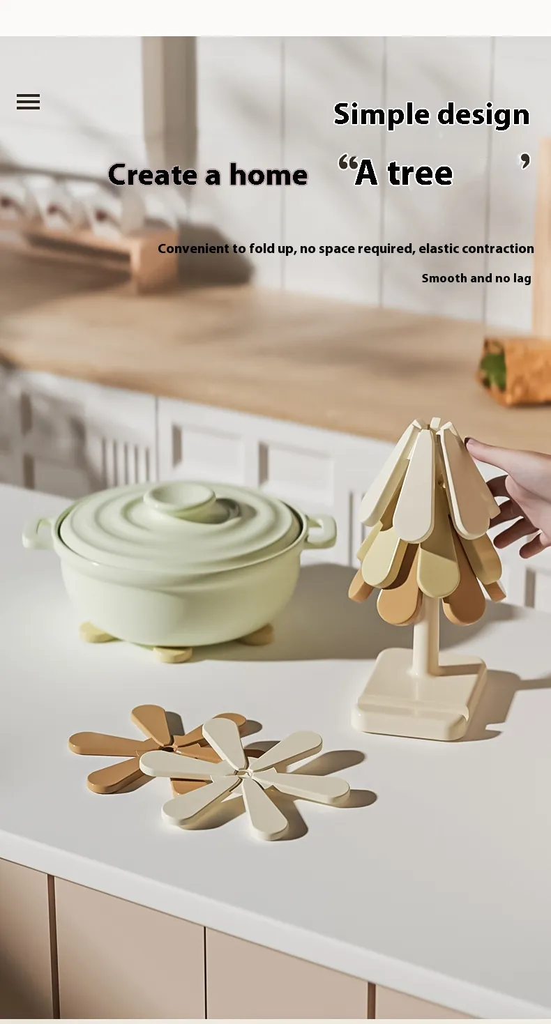 【Tree Shape Trivet Set 】This set includes 3 silicone trivets and a space-saving bracket, designed to shield countertops and table surfaces from heat damage caused by hot dishes and cookware.