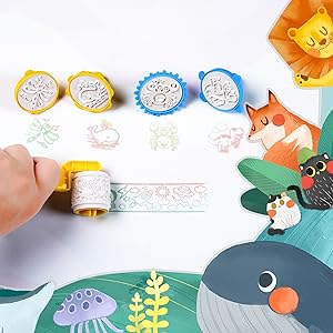 The Coloring Mat comes with 1*Mat + 4*Magic Pens + 4*Cutout Drawing Pads + 8*Sponge Stencils + 3*Rubber Stamps + 1*Roller