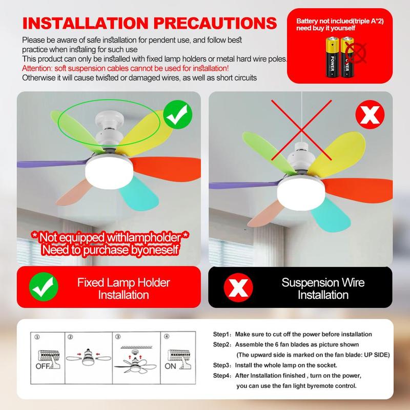 🌞New Flower-shaped Fan Lamp: 6 pieces blade with three speeds (240r/min 270r/min 300r/min).Plug-in fan blade design, safe, stable and easy to disassemble and clean, storage does not take up space, regardless of spring, summer, autumn and winter, it can be used is a lamp or a fan. And the fan light uses an E27 standard screw-in that can be easily installed on any 27 bulb base.