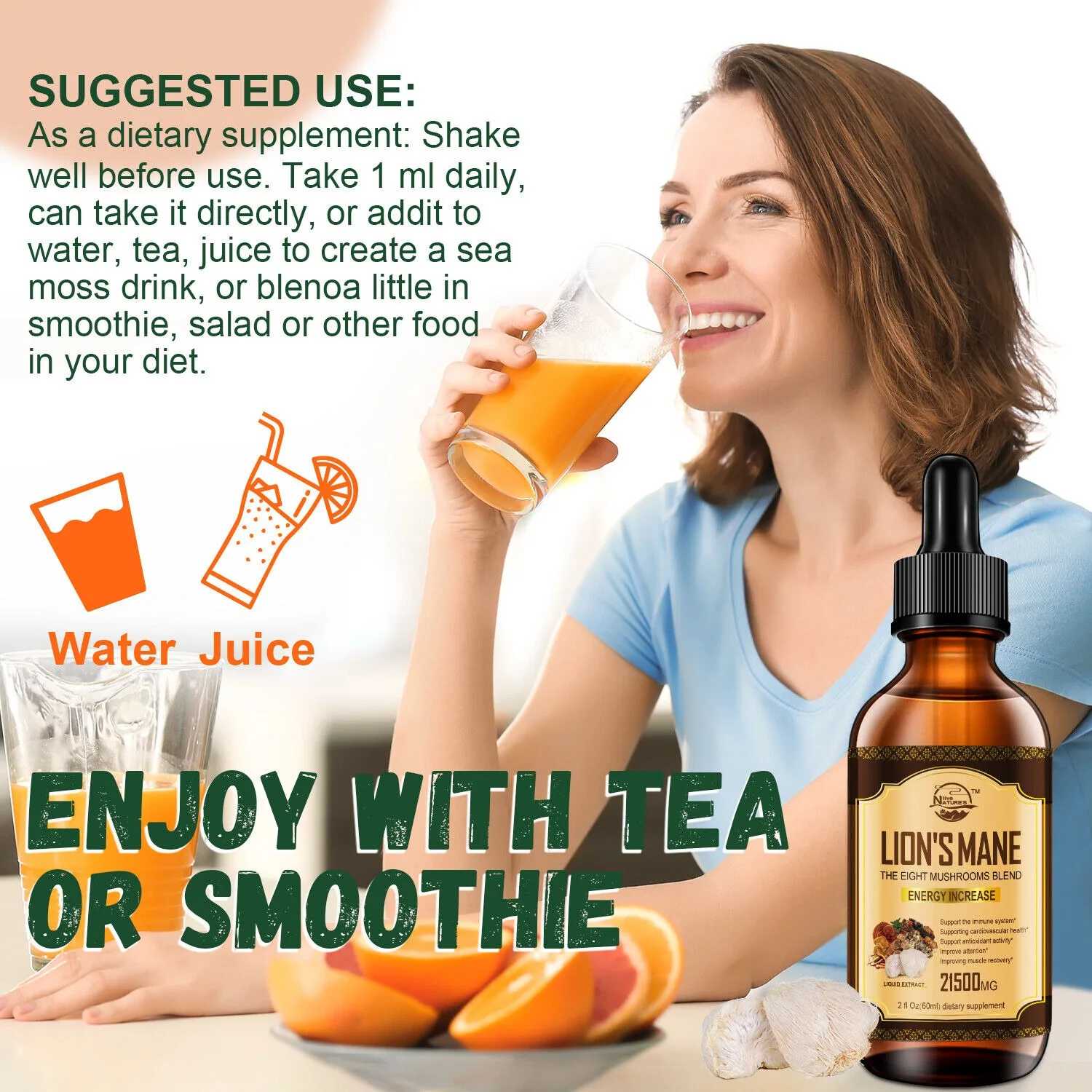 Using the 60ml Lion Mane, Chaga Mushroom Complex Reishi Extract Liquid Herbal Drops is simple and straightforward. Here’s how to incorporate it into your daily routine: