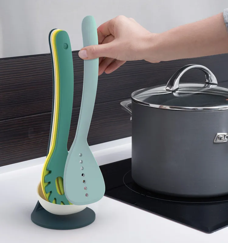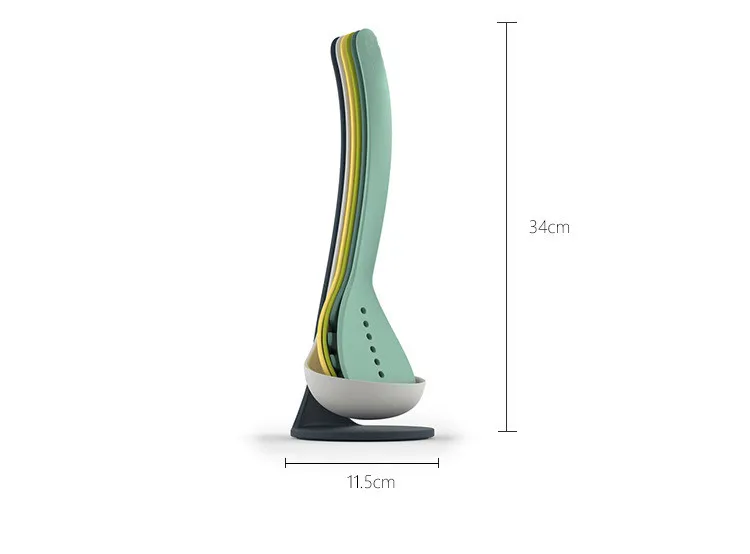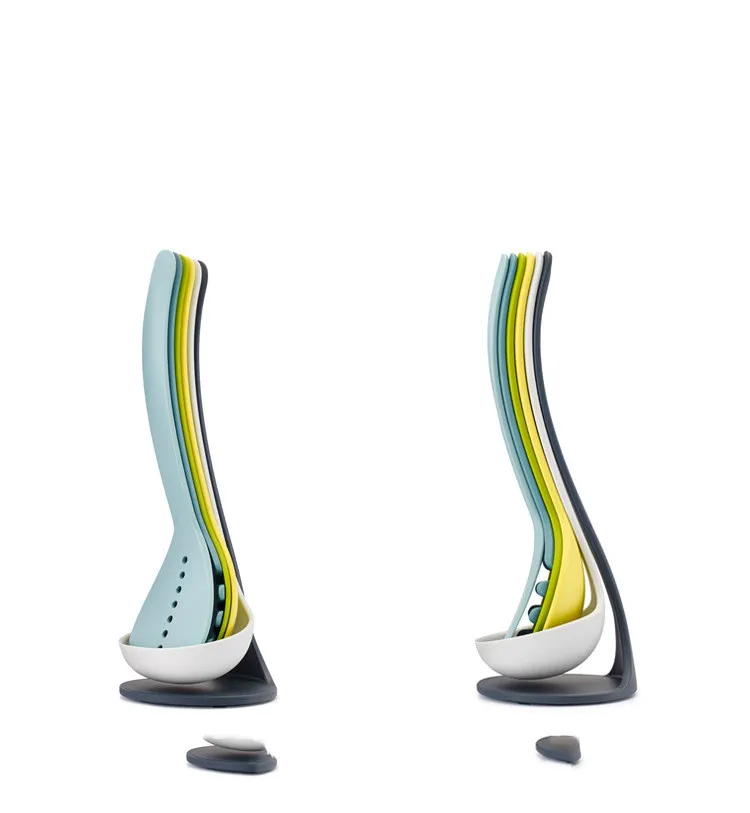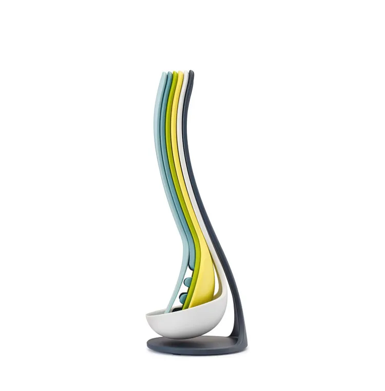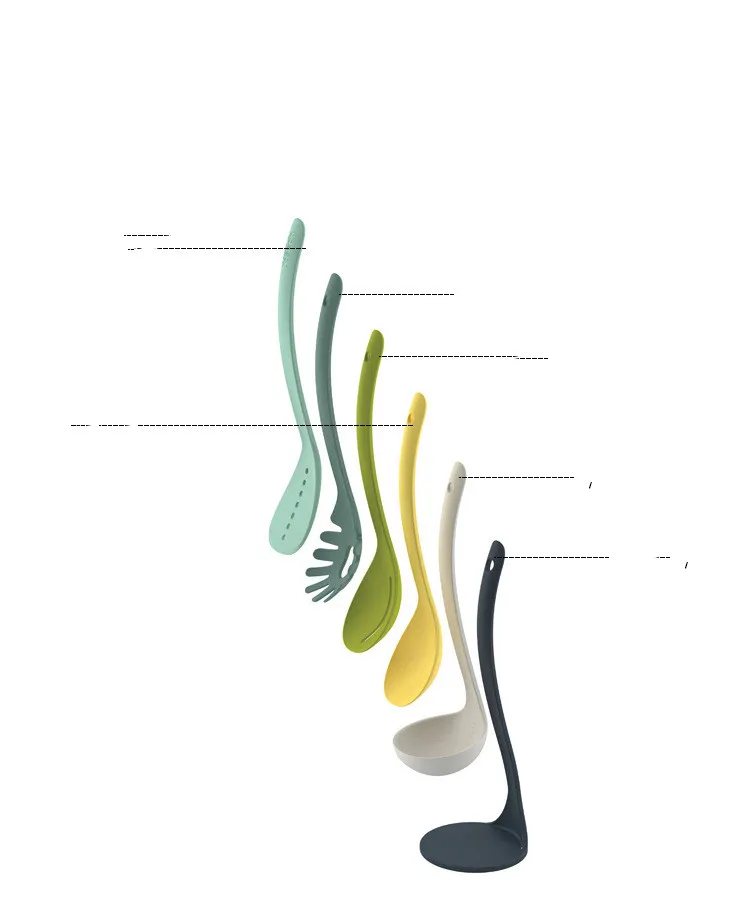 The set includes a slotted spatula, spaghetti server, slotted spoon, solid spoon, ladle, and storage stand, which very multifunctional and
