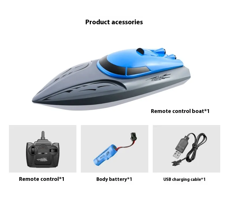 Remote controlled boat * 1 Remote control * 1 Body battery * 1 USB charging cable * 1