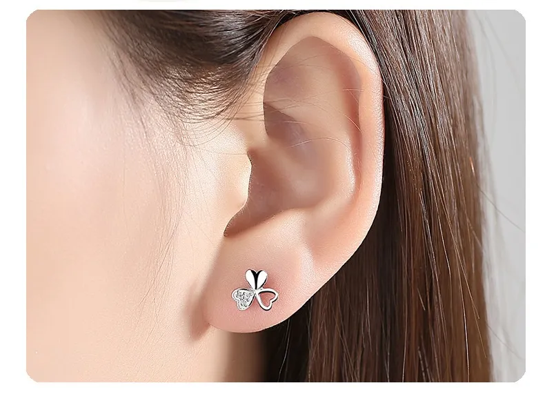925 Silver Lucky Clover Zircon Stud Earrings Flower Cute