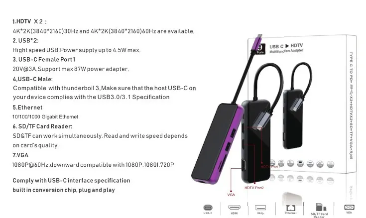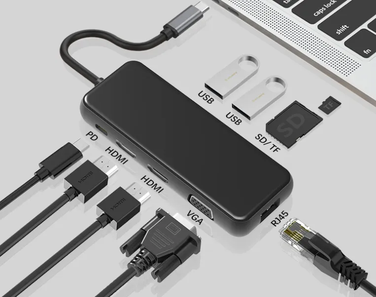 Beyond video outputs, the 9-in-1 hub includes a Gigabit Ethernet port, ensuring fast and stable internet connectivity, perfect for remote work, gaming, or streaming. Additional USB-A and USB-C ports offer support for peripheral devices such as keyboards, mice, and external drives, while an SD/TF card reader allows quick access to your memory cards. The compact and portable design makes it easy to carry this hub wherever you go, ensuring you always have the connectivity you need, whether you're at the office, working from home, or on the go.
