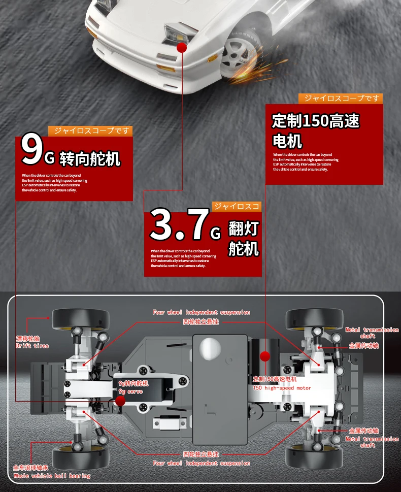 Boutique drift, multi -link design. Style 1:18 Restore the original car, and the appearance is completed in the actual proportion. Metal transmission shaft, customized 150 high -speed customization, drift tires, headlights can remotely control the third channel to control the flip light, with 9g steering servo, sustainable power consumption for 30 minutes, full -proportion linear control throttle and steering, tire motor belt block protection protection , The battery circuit board is overcharged, overdose, low-voltage protection, automatic frequency, remote control distance of 30-50 meters.