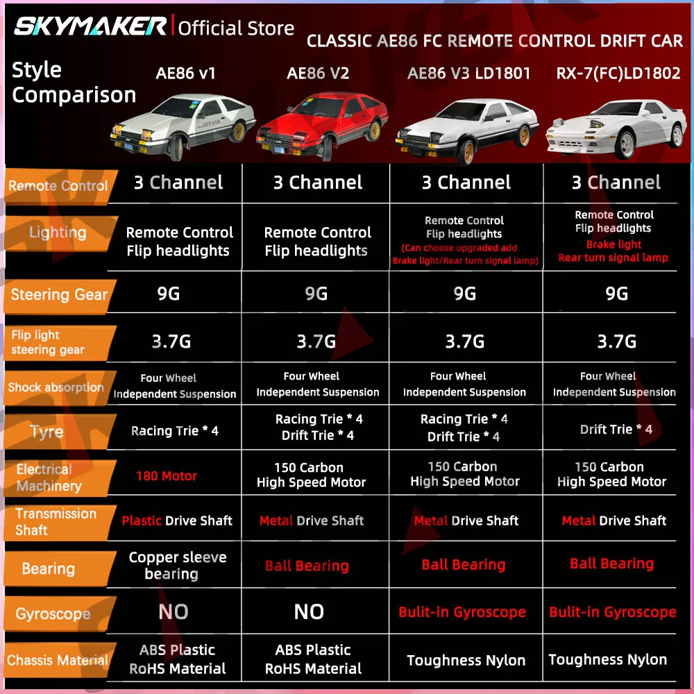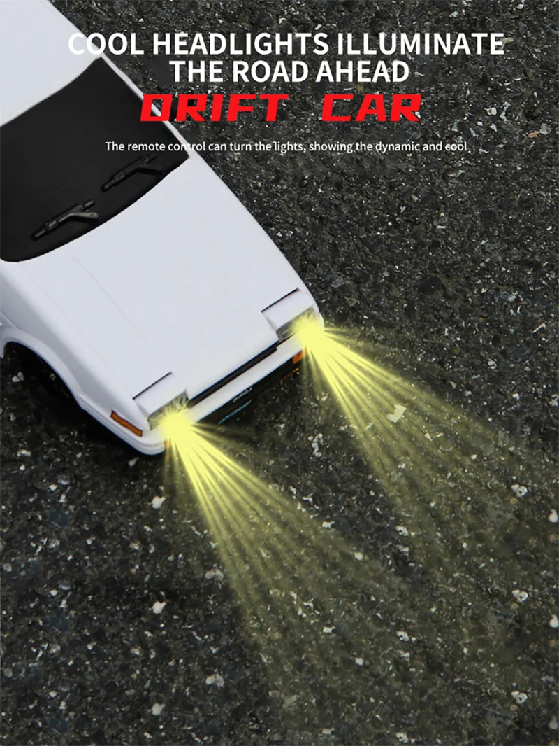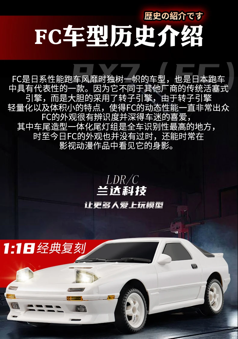 This 1:18 scale AE86 Model RX-7 FC RC drift car features a 2.4G remote control, ESP gyroscope, and LED lights. Designed for on-road drifting, it offers precise control and thrilling performance, making it an exciting mini RC racing car toy for enthusiasts and kids.AE86 RX-7 FC Model LD1801 LD1802 RC Car 1/18 2.4GRemote Control AWD On Road 15Km/H ESP Gyroscope LED Light RC Drift Racing Toy Car Gift for Boy