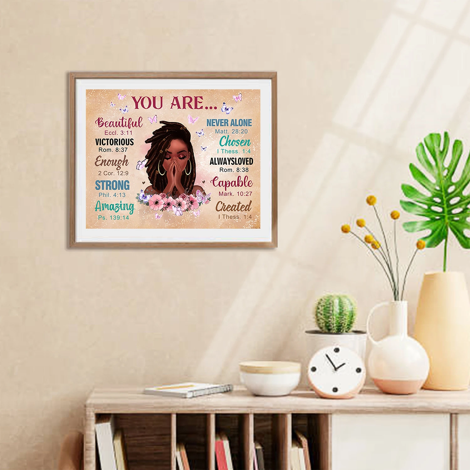 Crafted with care and designed to inspire, this wall art brings positivity and strength to your space. The Christian message embedded within the art reminds us of the importance of faith, empowerment, and self-love, making it a perfect choice for Christian women and those looking to honor African American culture and beauty.