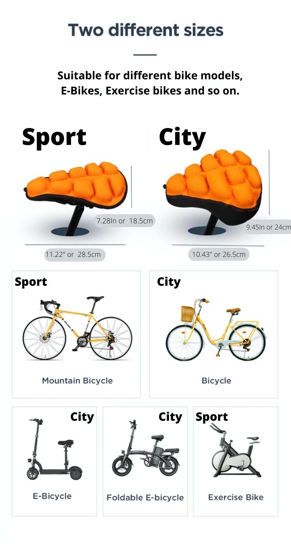 Aircush® is designed to fit 99% of the bikes in the market including e-bikes using traditional saddles. You can simply choose sport or city according to the shape of your saddle. You can also quickly measure your bike saddle to be sure about the size.