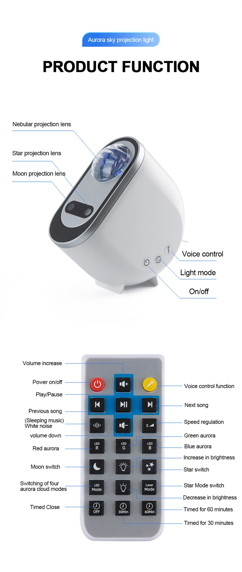 2. The remote control can also adjust the speed of the movement of the Northern Lights clouds, the brightness of the lights (4 levels of
