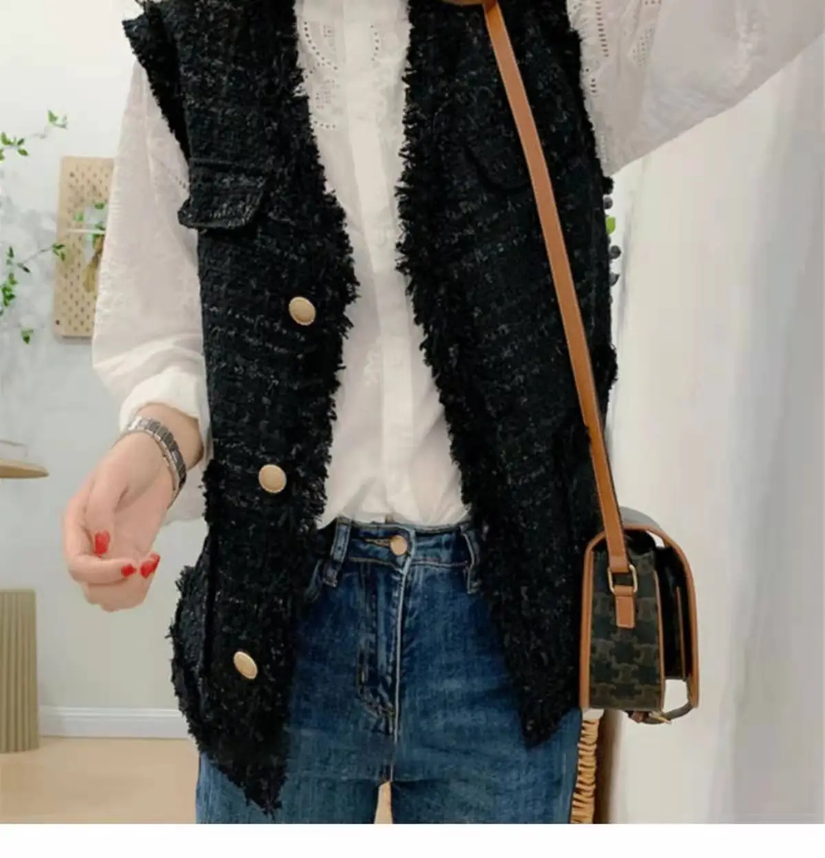 Channel a chic Western vibe with this waistcoat, designed to accentuate your autumn and winter outfits. The structured silhouette and textured tweed fabric make it a standout piece, exuding a refined yet approachable aura.