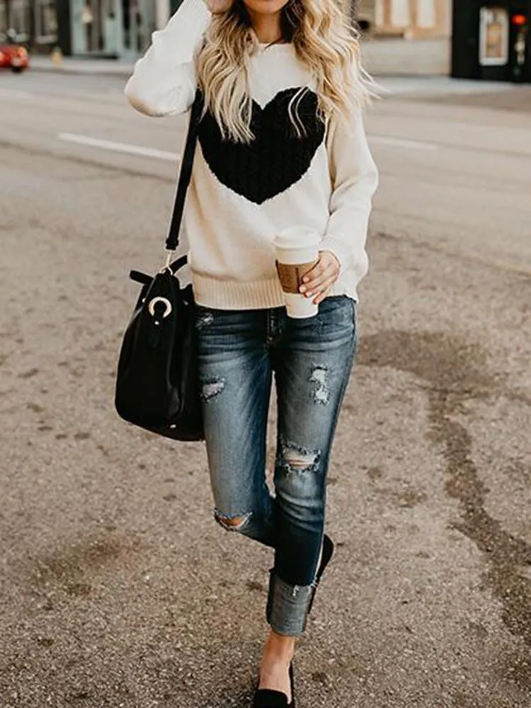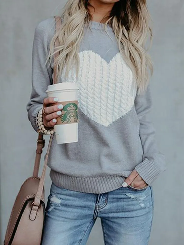 Autumn Winter Women Sweaters Heart Pattern Printed Long Sleeve Tops O-Neck Lovely Pullovers Knitted Loose Sweaters Tops
