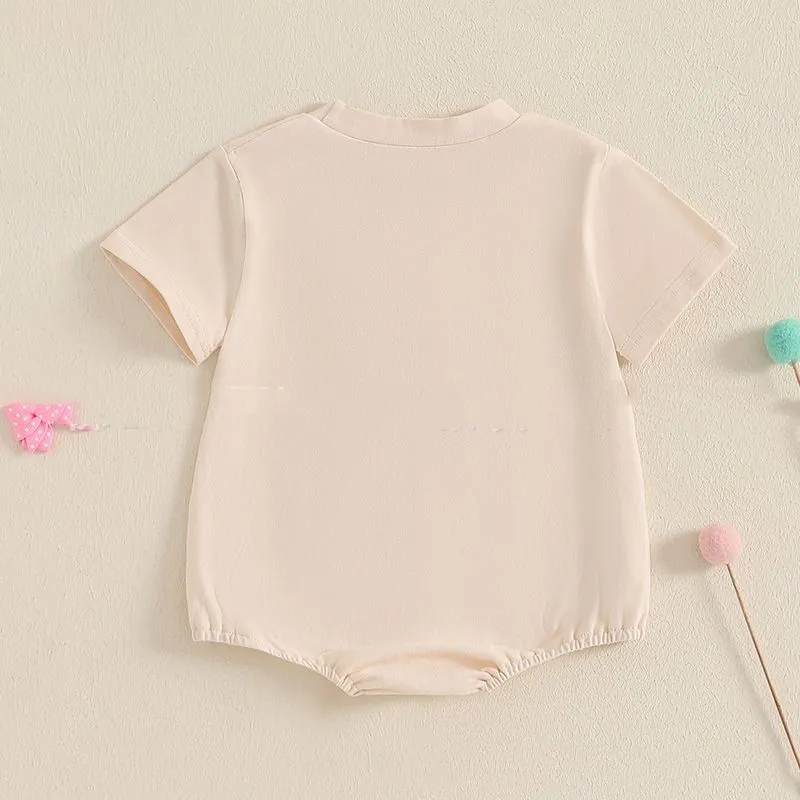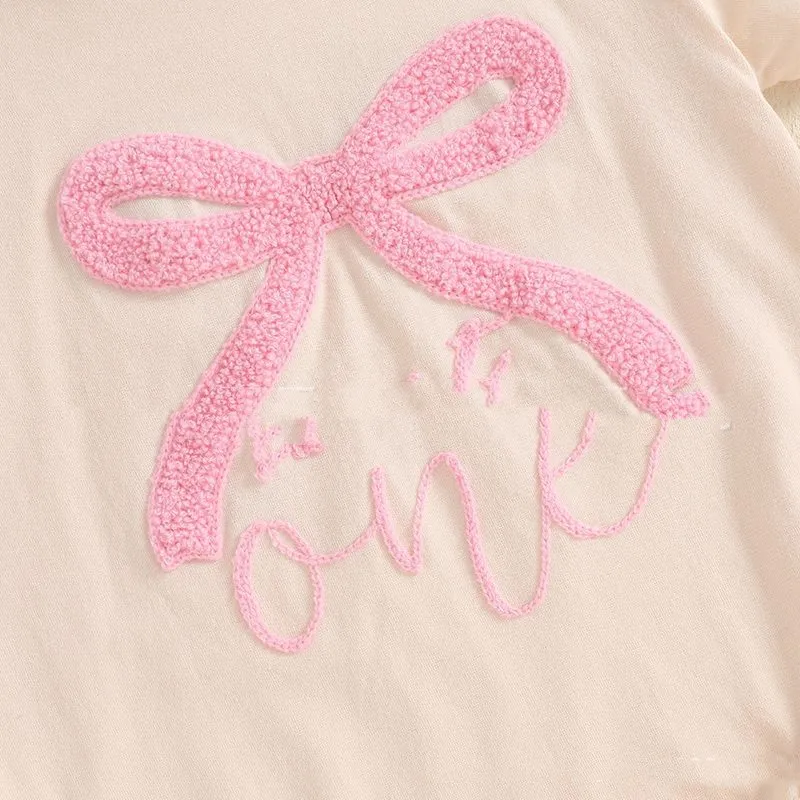 The standout feature of this romper is the cute bow detail and towel embroidery. The bow adds a sweet, feminine touch to the romper, while the embroidered design gives it an extra layer of charm. The combination of these delicate details makes this romper the perfect piece for dressing up your little girl in a fun and fashionable way.