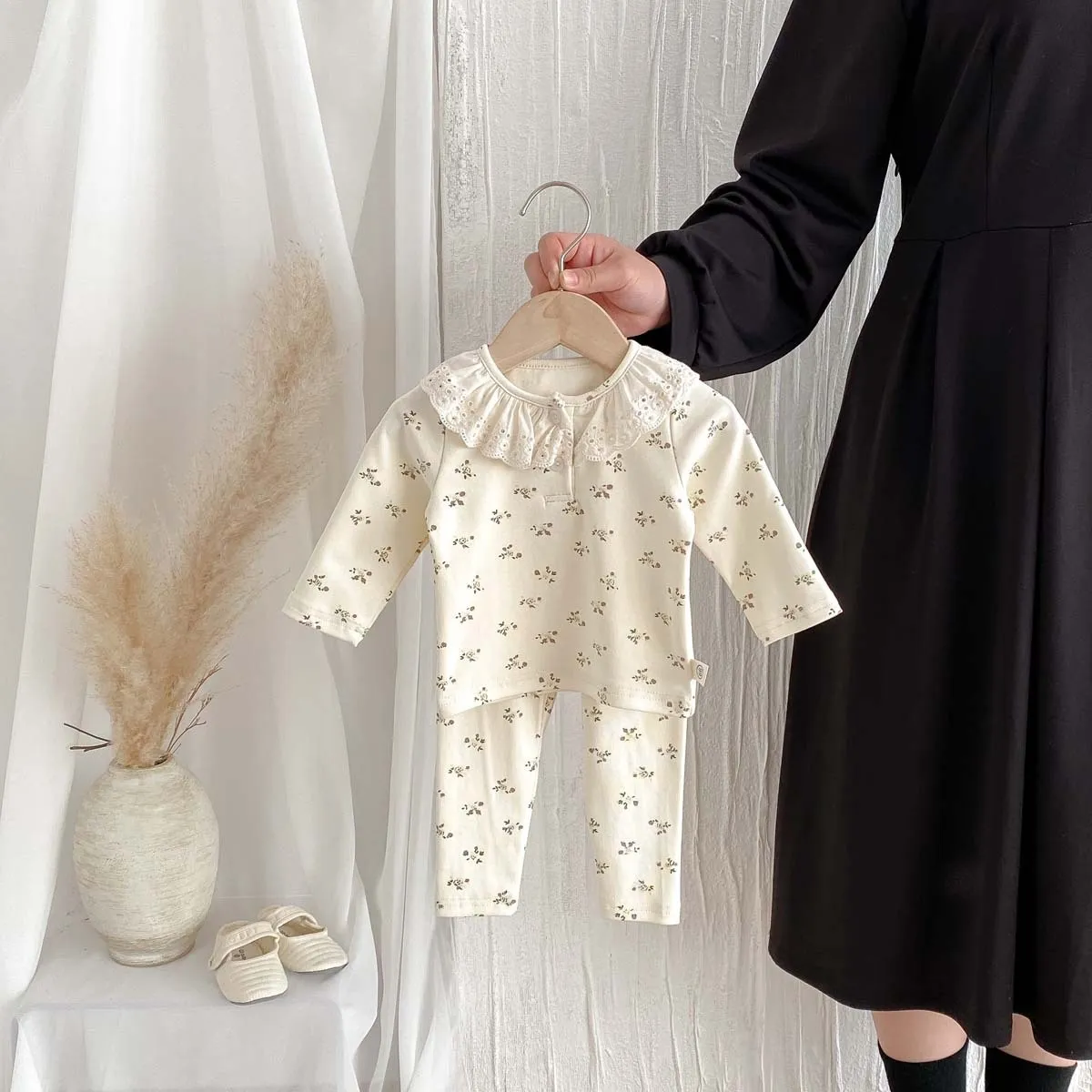 Two-Piece Set Design: The set includes a top with a lace ruffled collar and matching bottoms, making it easy to dress your