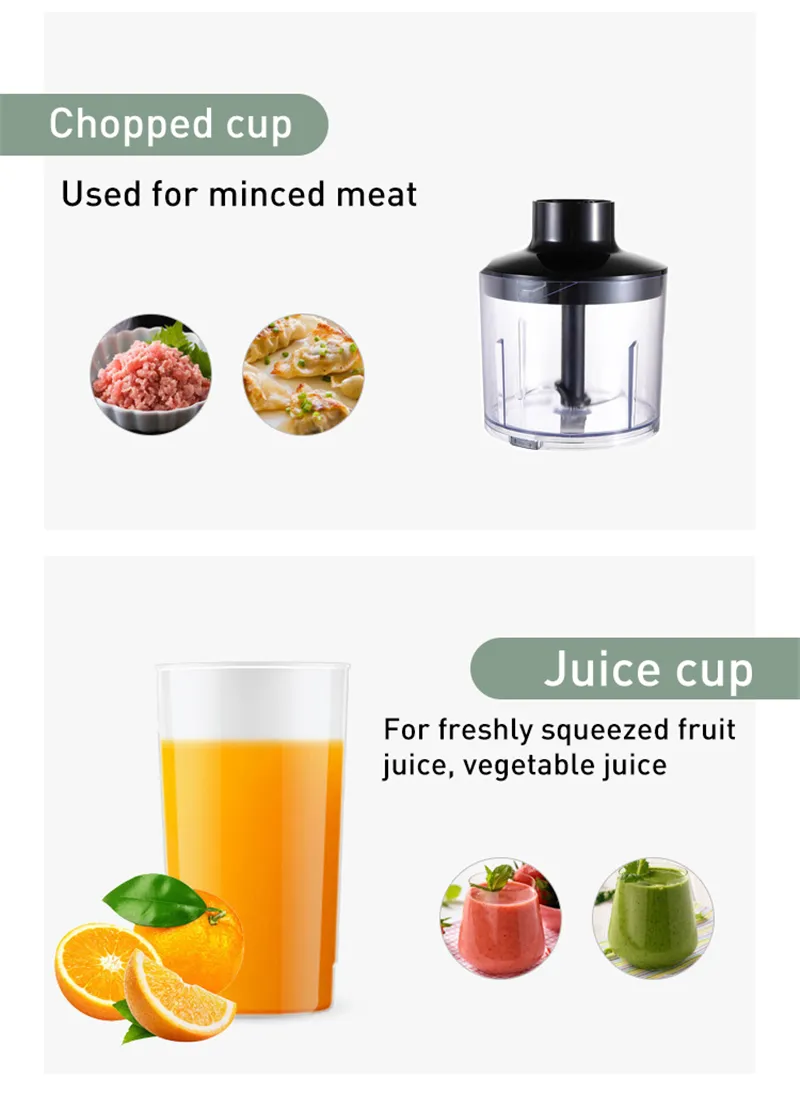 Functions: Juicing, cutting vegetables, mincing meat, dry grinding, stirring, beating eggs, making milkshakes, mixing
