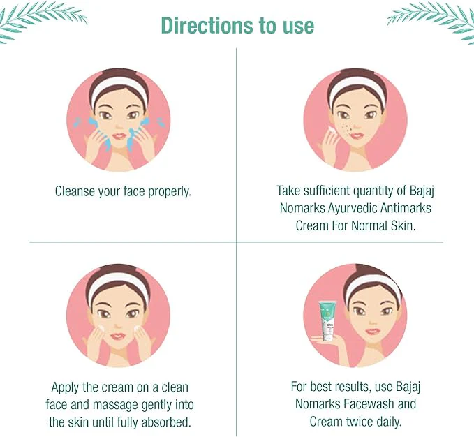 Take a small amount of Bajaj No Marks Skin Cream and apply it evenly to your face and neck. Use gentle circular motions to massage the cream into your skin, focusing on areas with dark spots, acne marks, or other skin imperfections.