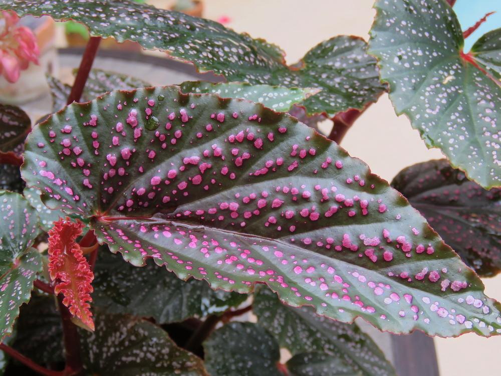 The leaves of the Begonia 'Benigo Pink' are a spectacular display of artistry by nature. They are medium to large, with a heart or shield-like shape, and their surface is adorned with delicate pink spots that seem to dance across the lush green canvas. The edges of the leaves are often tinged with a rich, dark red hue, adding depth and contrast to the overall appearance. The underside of the leaves maintains this dramatic coloration, making the plant equally attractive from all angles.