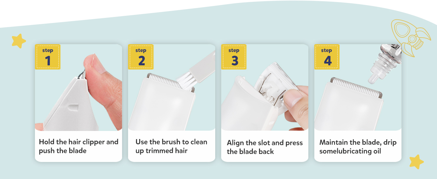 - 【Detachable and fully Washable】 The cutting unit is detachable, and the whole body of this baby hair trimmer is waterproof at an IPX-7 level. This waterproof hair clipper can be cleaned and work normally when its body is dipped in the water for a short time. It would be easier to tidy up the hair by using the provided brush and then clean it in water.