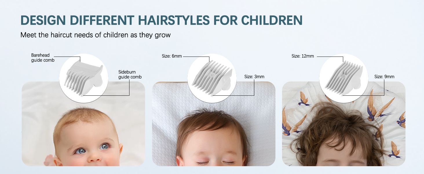 - Professional Accessories & Long Battery Life:Equipped with USB charging and an 800mAh lithium battery, it offers up to three months of use on a single charge, with the ability to use while charging. It comes with three guide combs to accommodate different hairstyles and lengths, providing an extra layer of safety for your baby's skin