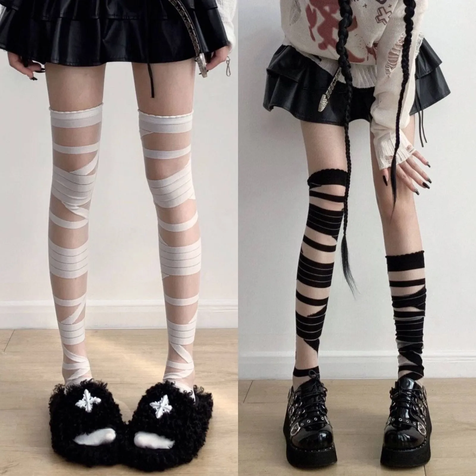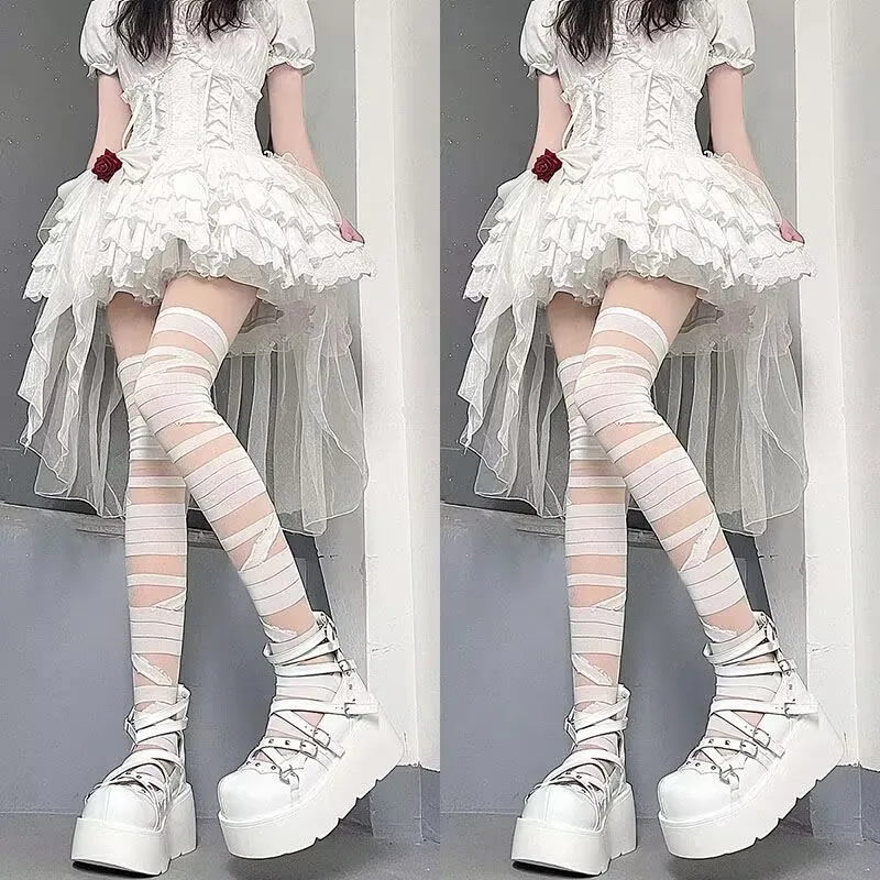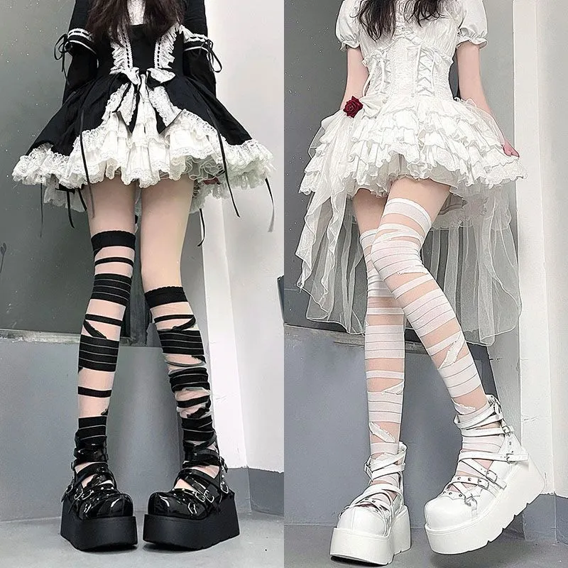 Black And White Bandage Long Tube Silk JK Uniform Cross Strap Over The Knee Stockings Stockings