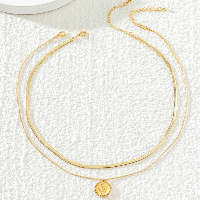 Blade Chain Double Layer Twin Rose Brass Gold Plated Short Necklace