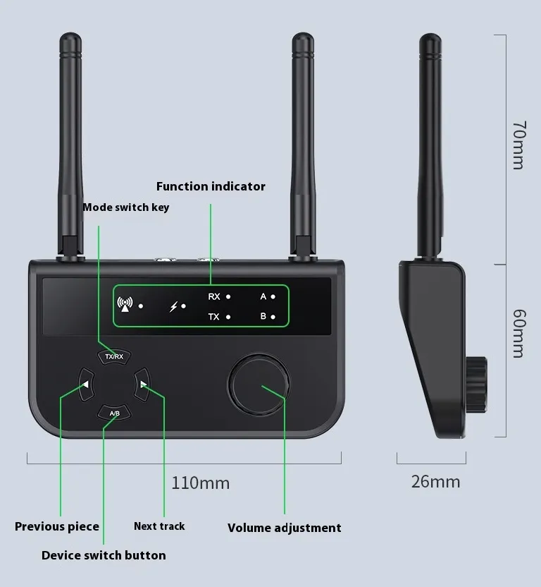 This device seamlessly functions as both a Bluetooth music receiver and a Bluetooth transmitter. As a receiver, it connects to your wired audio devices (such as speakers, headphones, or car audio systems) and enables them to receive audio wirelessly from your Bluetooth-enabled smartphone, tablet, or laptop. As a transmitter, it sends audio from a non-Bluetooth device, such as a TV, PC, or stereo, to Bluetooth headphones or speakers. This dual functionality makes it the perfect all-in-one solution for any audio setup.