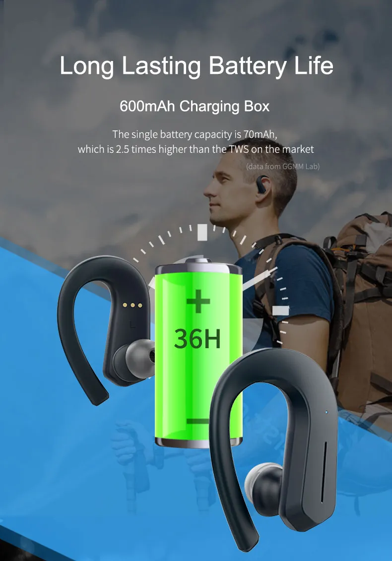 600 mAh charging box to charge the headphones 4 times, total playing time up to 36 hours, all day no need to charge the headphones