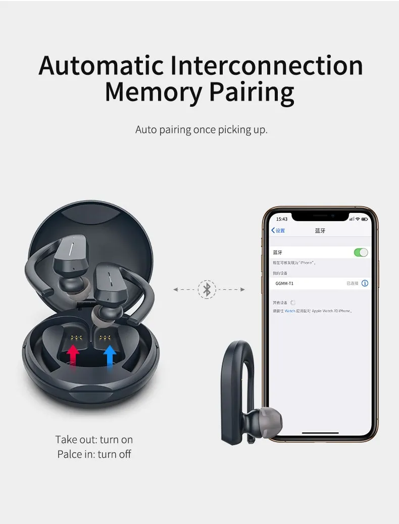 Auto pairing, get rid of complicated operate, just take it out from charging box to get ready connection, 2 step finish connection, save more time, put it back to get power from wireless charging, magenetic design to protect your earphone when long time use