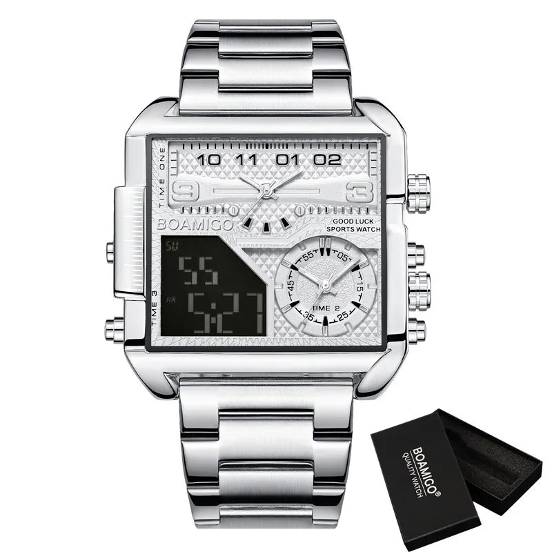 The BOAMIGO New Top Brand Luxury Fashion Men's Watch is a statement of style, sophistication, and precision. Designed for the modern man who appreciates both functionality and fashion, this watch effortlessly combines luxury with sporty aesthetics. With its gold stainless steel finish, square design, and a powerful blend of digital and analog display, this timepiece stands out from the crowd. Whether you’re at a formal event, on a business meeting, or enjoying a casual day out, this watch adds a touch of elegance to any outfit.