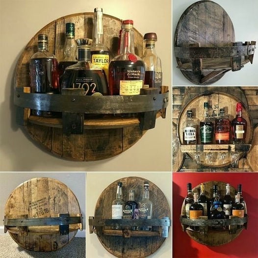 Display your bourbon or whiskey collection on this shelf made entirely from whisky bourbon barrel heads, staves and the metal bands
