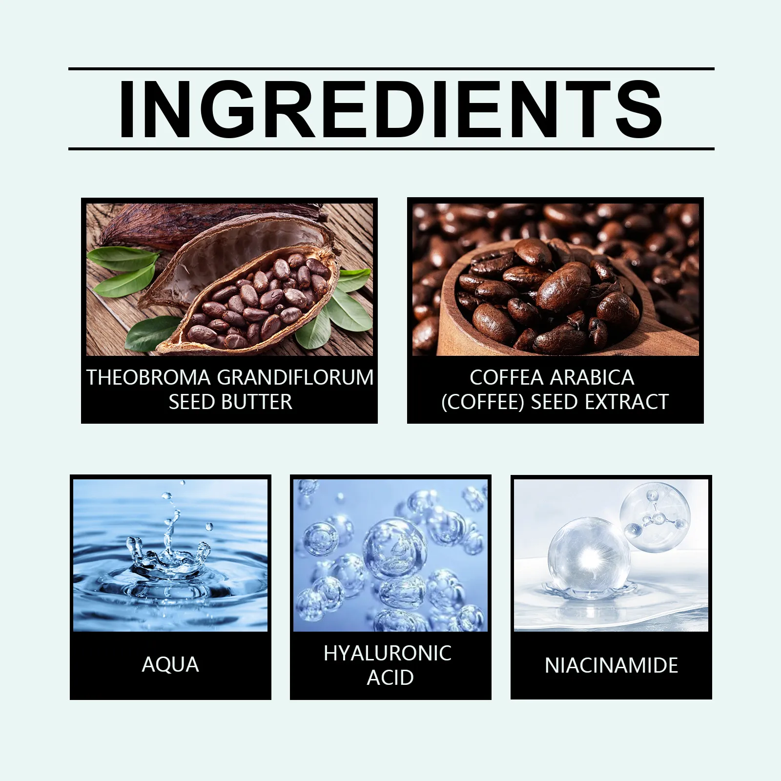 Ingredients: water, coffee extract, hyaluronic acid, cocoa tree seed oil, nicotinamide