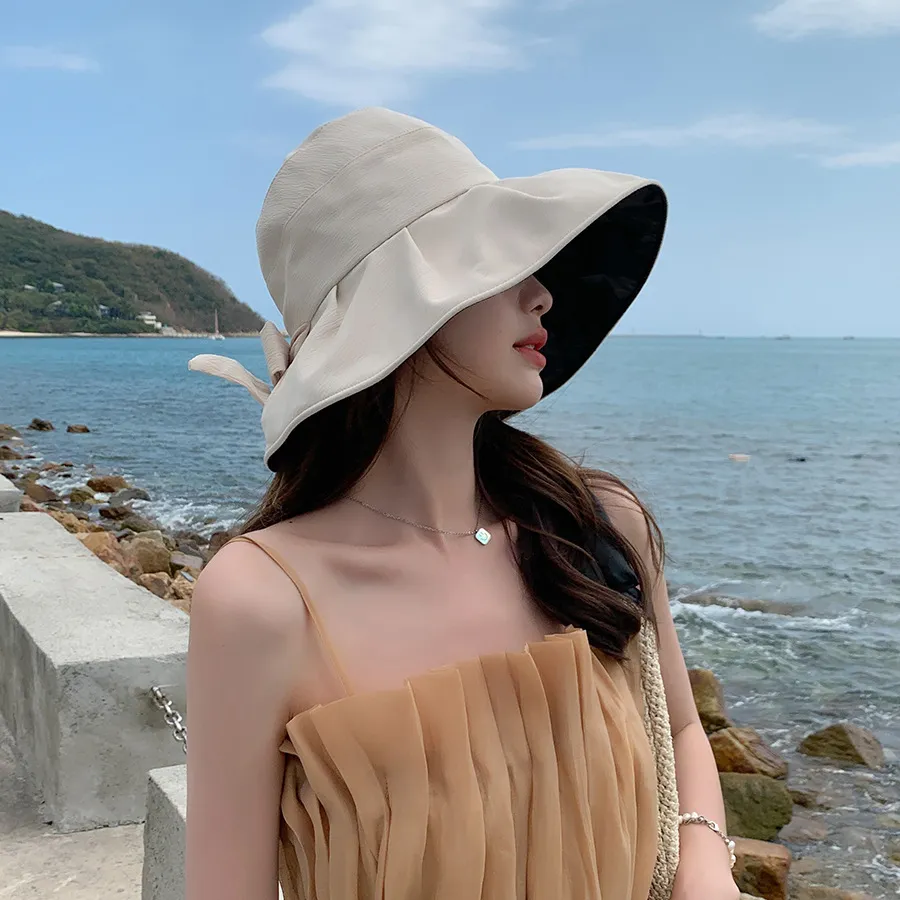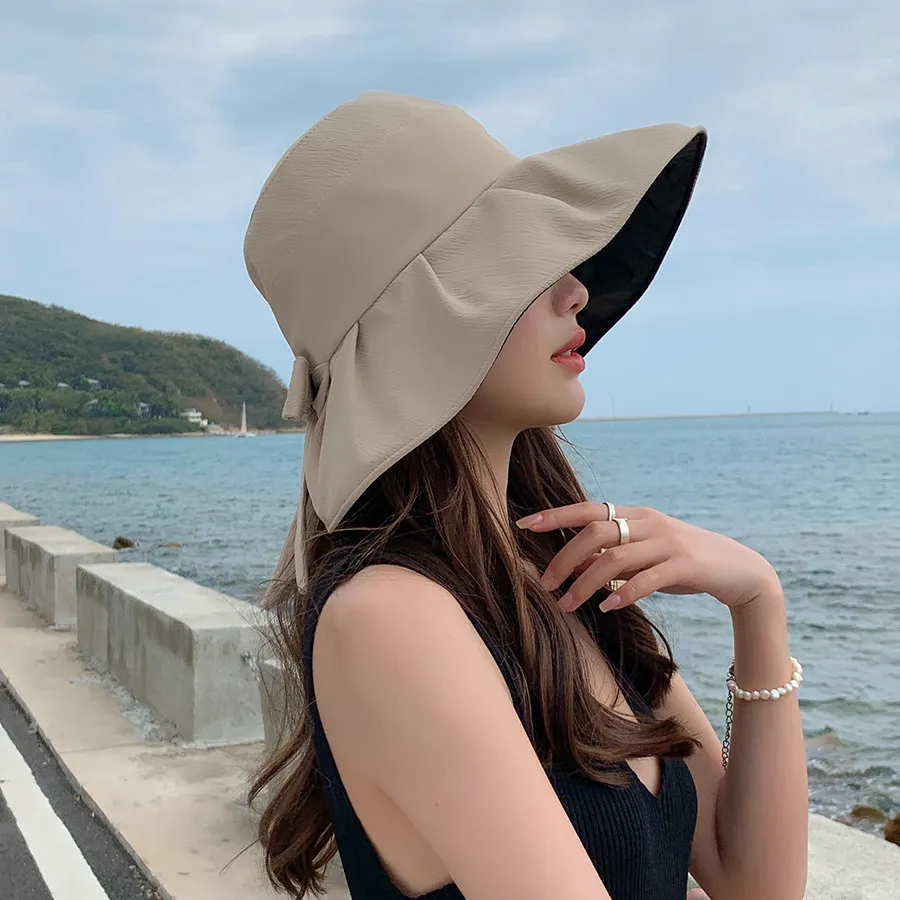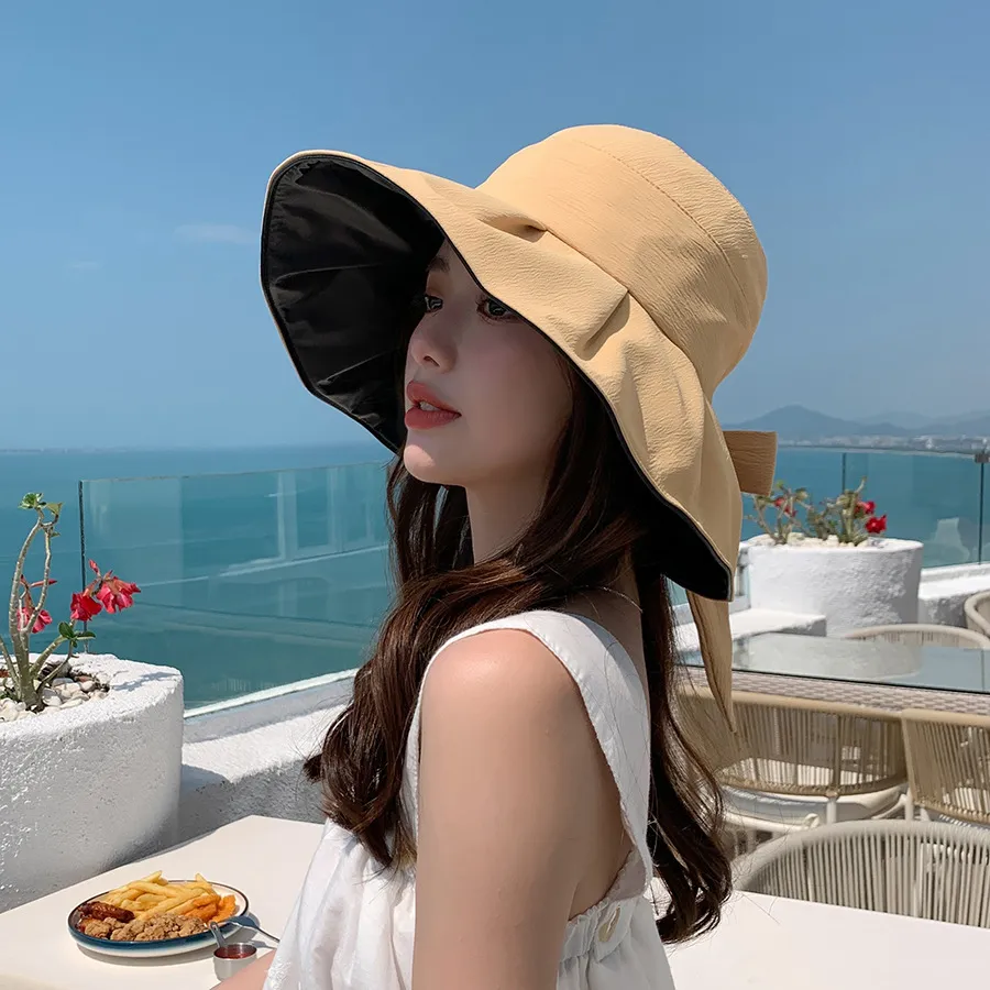 Bucket Hat Vinyl Sun Protective Wide Brim Hat Solid Color Wrinkle Bow Hat